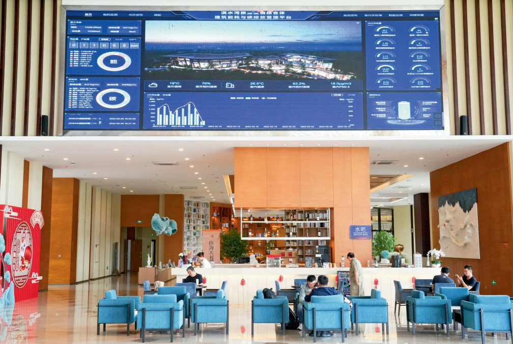 海南文昌,淇水湾旅游度假综合体,大屏幕显示建筑能耗与碳排放信息。 视觉中国供图