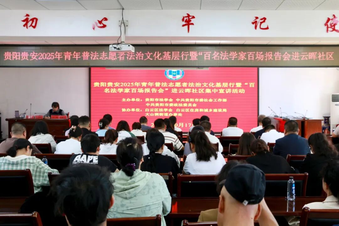 此次活动是贵阳贵安2025年青年普法志愿者法治文化基层行暨“百名法学家百场报告会”进云晖社区专场,由贵阳市法学会联合市委社工部、市委政法委共同主办,白云区法学会、白云区住房和城乡建设局、大山洞街道办事处协办,贵阳市法学会法学咨询专家吴启刚作主讲。