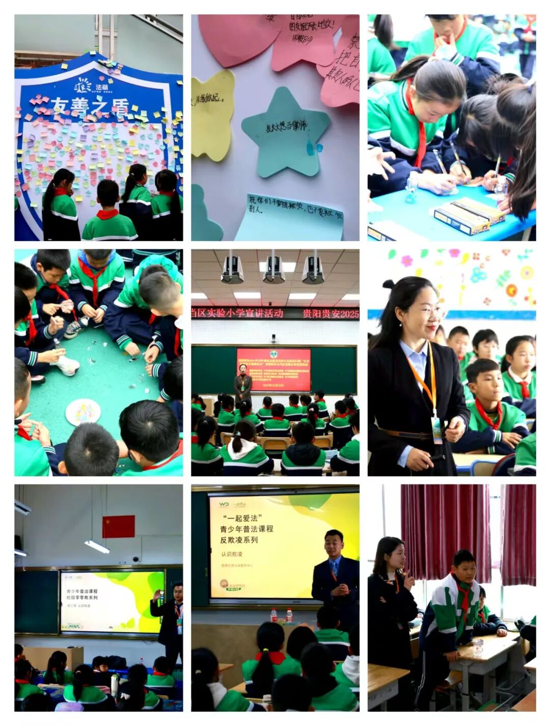 在总校区法治教育活动中,“反对校园欺凌”主题课堂气氛热烈。市法学会团体会员贵州法萌教育科技有限公司讲师团队结合《中华人民共和国未成年人保护法》,用身边小故事给同学们解析校园欺凌的表现形式与法律后果,告诉大家“遇到欺凌别慌”。活动最热闹的要数“友善之盾”环节,同学们亲手DIY“情绪冷静瓶”,把“不冲动、会冷静”的小秘诀装进瓶子里。