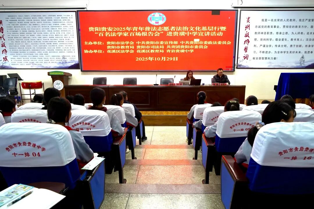 近日,贵阳贵安2025年青年普法志愿者法治文化基层行暨“百名法学家百场报告会”宣讲活动走进青岩贵璜中学。