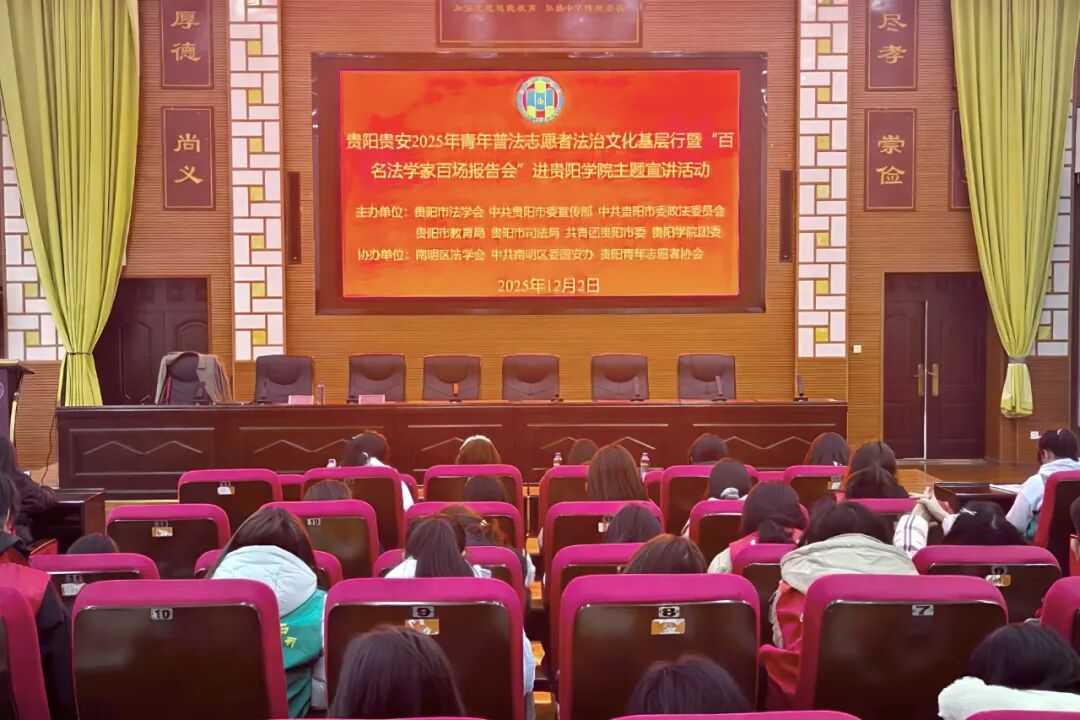 近日,贵阳贵安2025年青年普法志愿者法治文化基层行暨“百名法学家百场报告会”走进贵阳学院开展宣讲活动。本次活动由市法学会联合市委宣传部、市委政法委、市教育局、市司法局、团市委、贵阳学院团委主办,南明区法学会、区委国安办、贵阳青年志愿者协会协办。