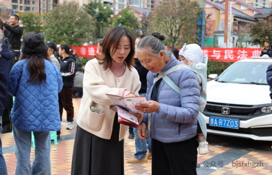 活动中,在非遗歌舞表演过程中,法学会抓住群众注意力集中的契机,同步开展两大核心普法行动:一是穿插“非遗+法治”互动问答,在非遗知识提问中融入民法典中与群众生活密切相关的内容(如邻里纠纷、消费维权等),通过抢答形式激发群众参与热情,让法律知识在趣味互动中被快速吸收;二是在文创市集设置普法咨询点,以“生活场景再现+法律条文解析”的沉浸式方式,将抽象法条转化为“婚姻家庭怎么维权”“财产继承有哪些规定”等实用生活指南,工作人员现场答疑解惑,让群众零距离学习法律知识。