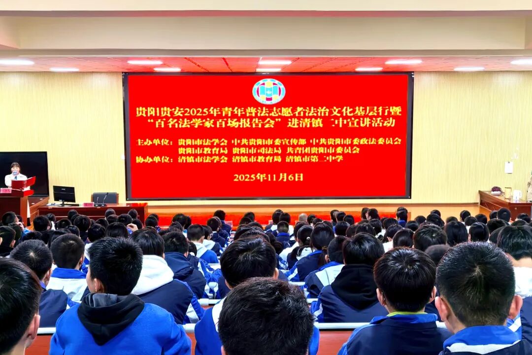 11月6日,贵阳贵安2025年青年普法志愿者法治文化基层行暨“百名法学家百场报告会”宣讲活动走进清镇市第二中学。